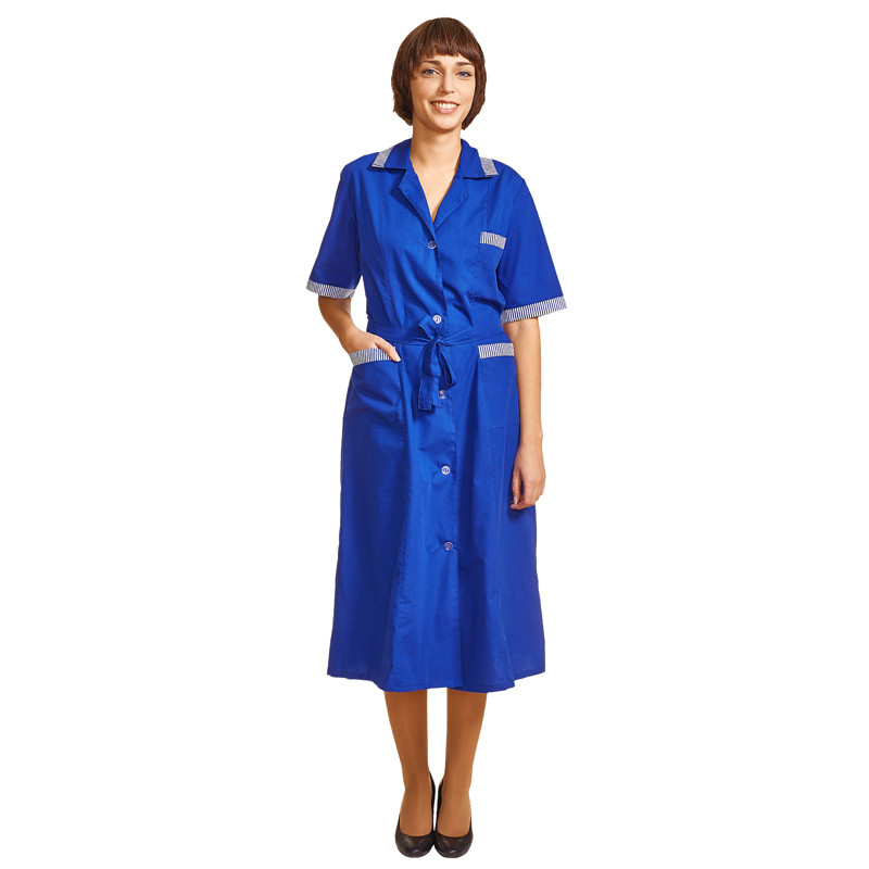 н и долговечен. Не мнется, легко и быстро стирается, быстро сохнет. Долго сохраняет свой первоначальный яркий цвет. Ткань дышит, благодаря входящему в состав хлопку, имеет повышенный срок службы и проста в уходе, благодаря полиэфиру. Рукав короткий. Воротник отложной с лацканами, есть накладные карманы. Отлет воротника, верхние части карманов и края рукавов отделаны светлой тканью. Халат застегивается на пуговицы. Униформа рекомендована для сферы обслуживания, клининга, гостиничного бизнеса.Также в коллекции униформы для горничных и уборщиц у01 представлены халаты у01-ХЛ в васильковом цвете с длинным рукавом. Цветовая гамма коллекции дополнительно представлена цветами бирюзовый и бордо, моделями халатов с длинным и коротки рукавами.